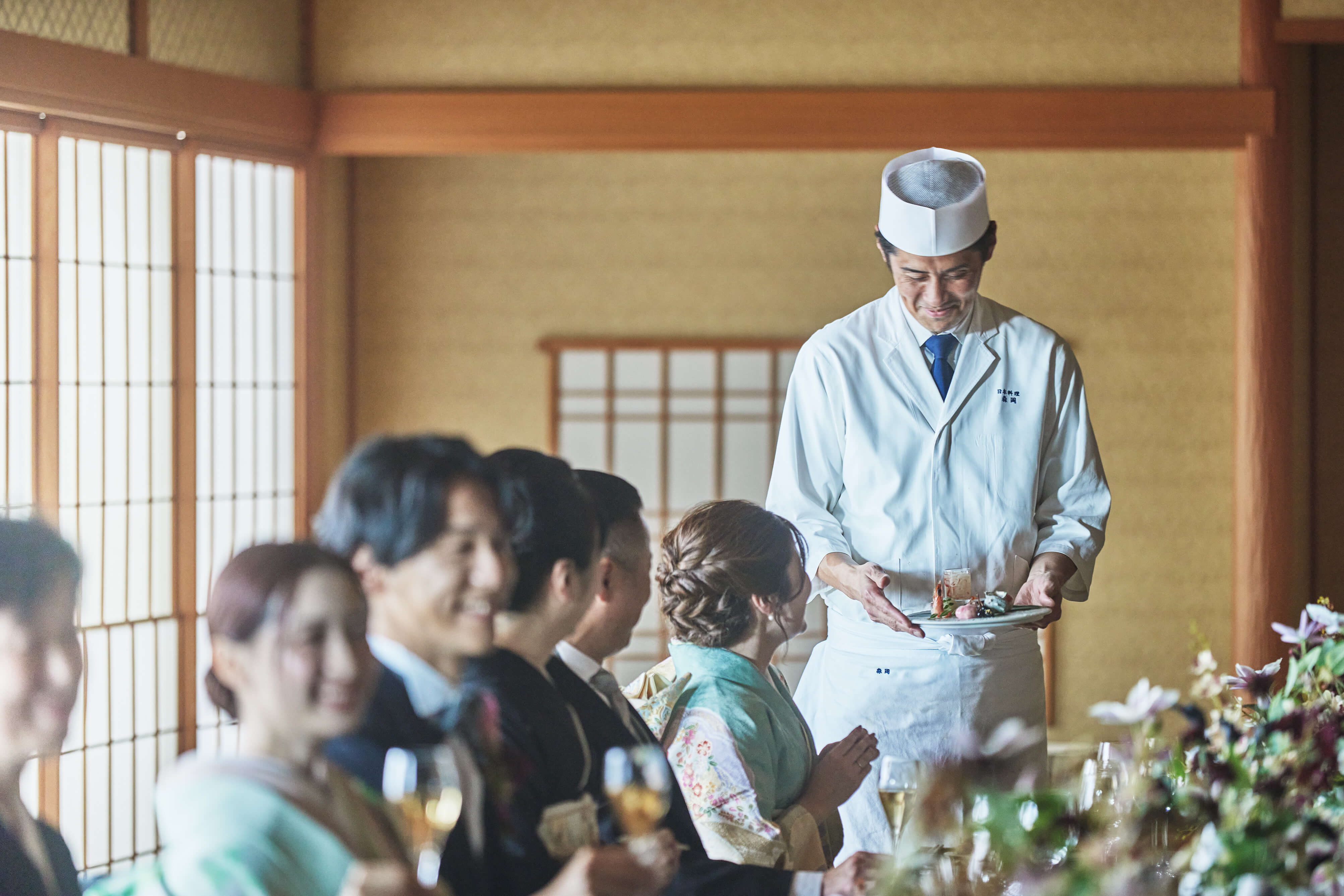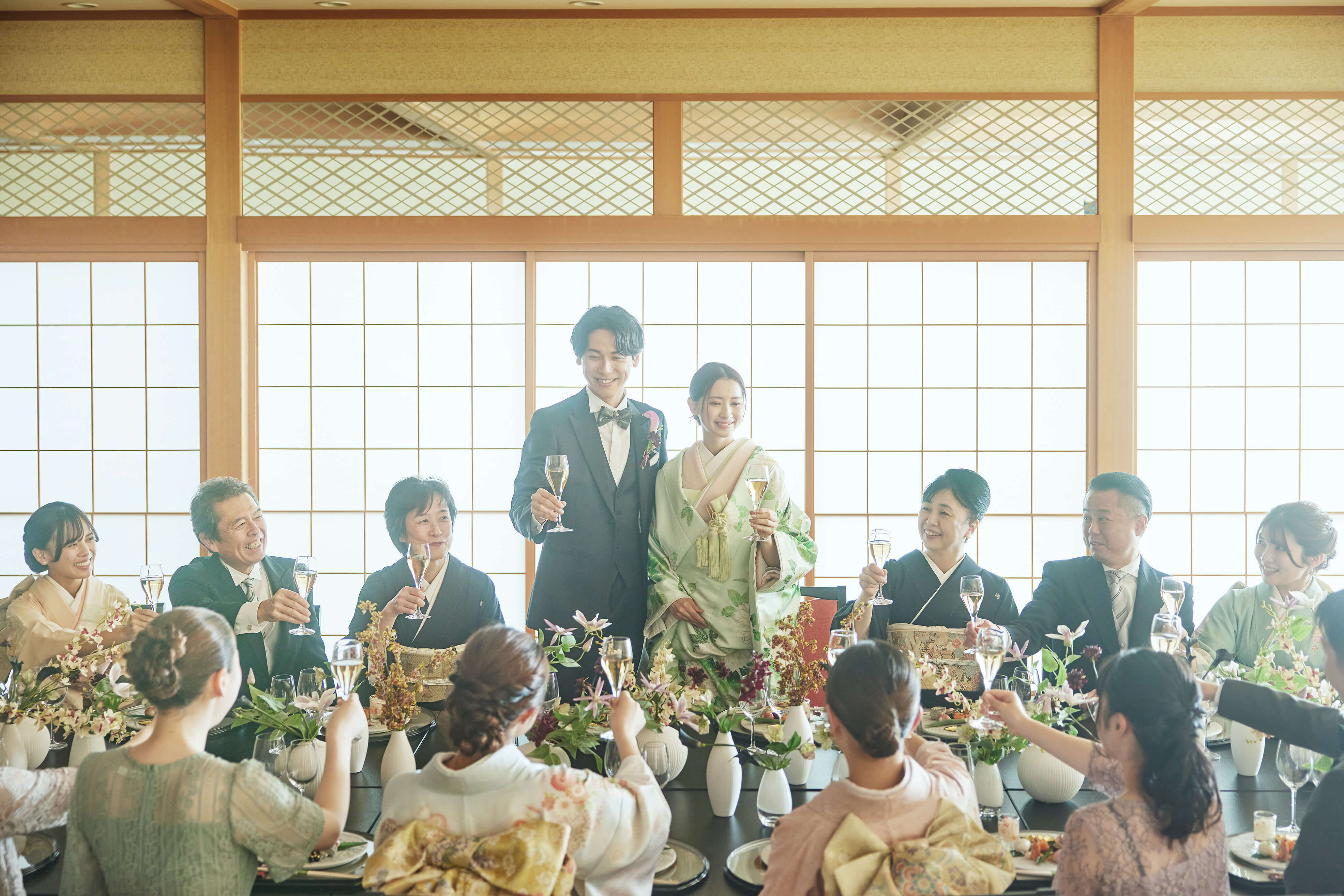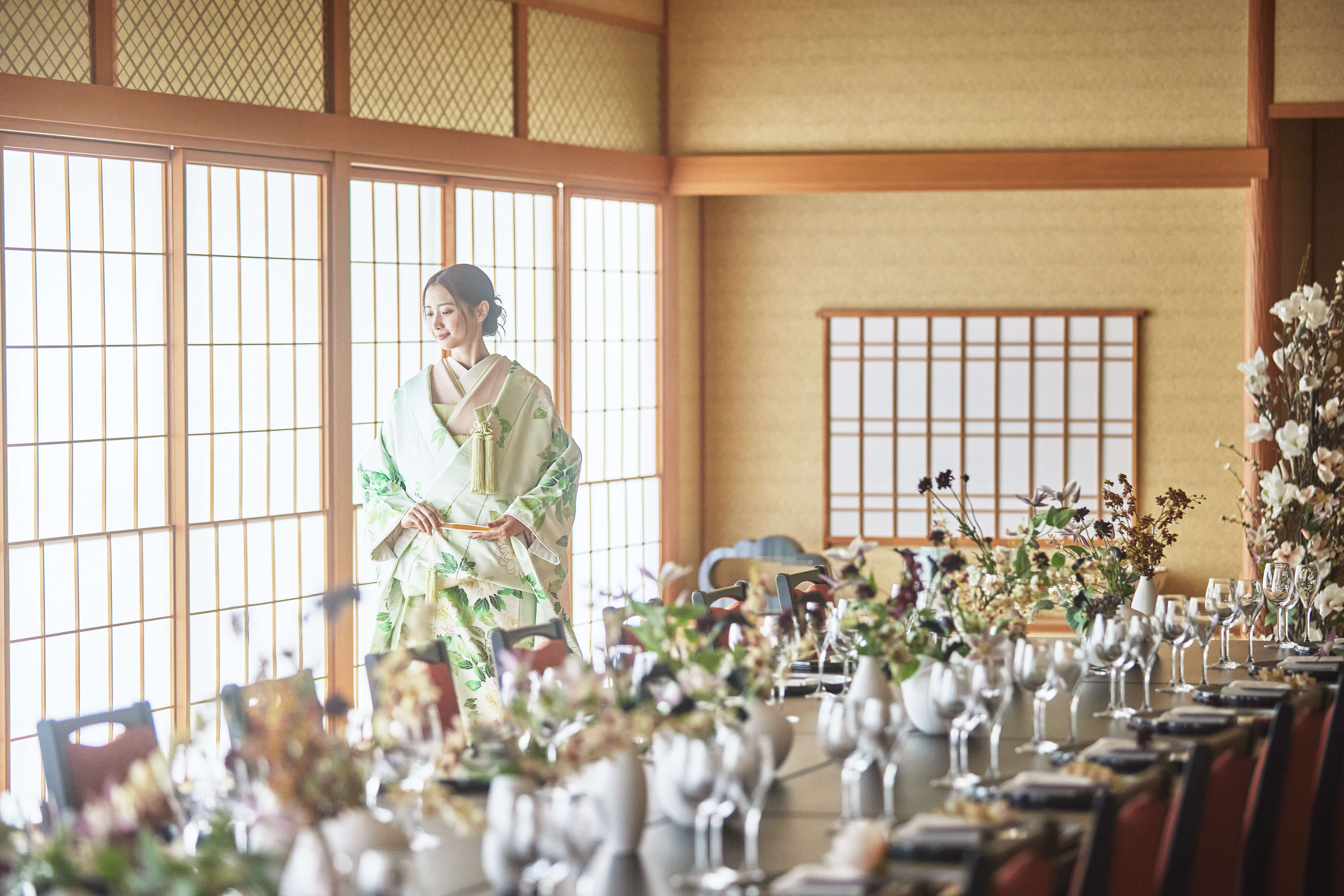 木格子ややわらかな灯りが織りなす上品な空間。日本の伝統美を大切にした設えが、ふたりとゲストをやさしく包み込みます。和装姿がいっそう引き立つ、格調高い披露宴が叶います。