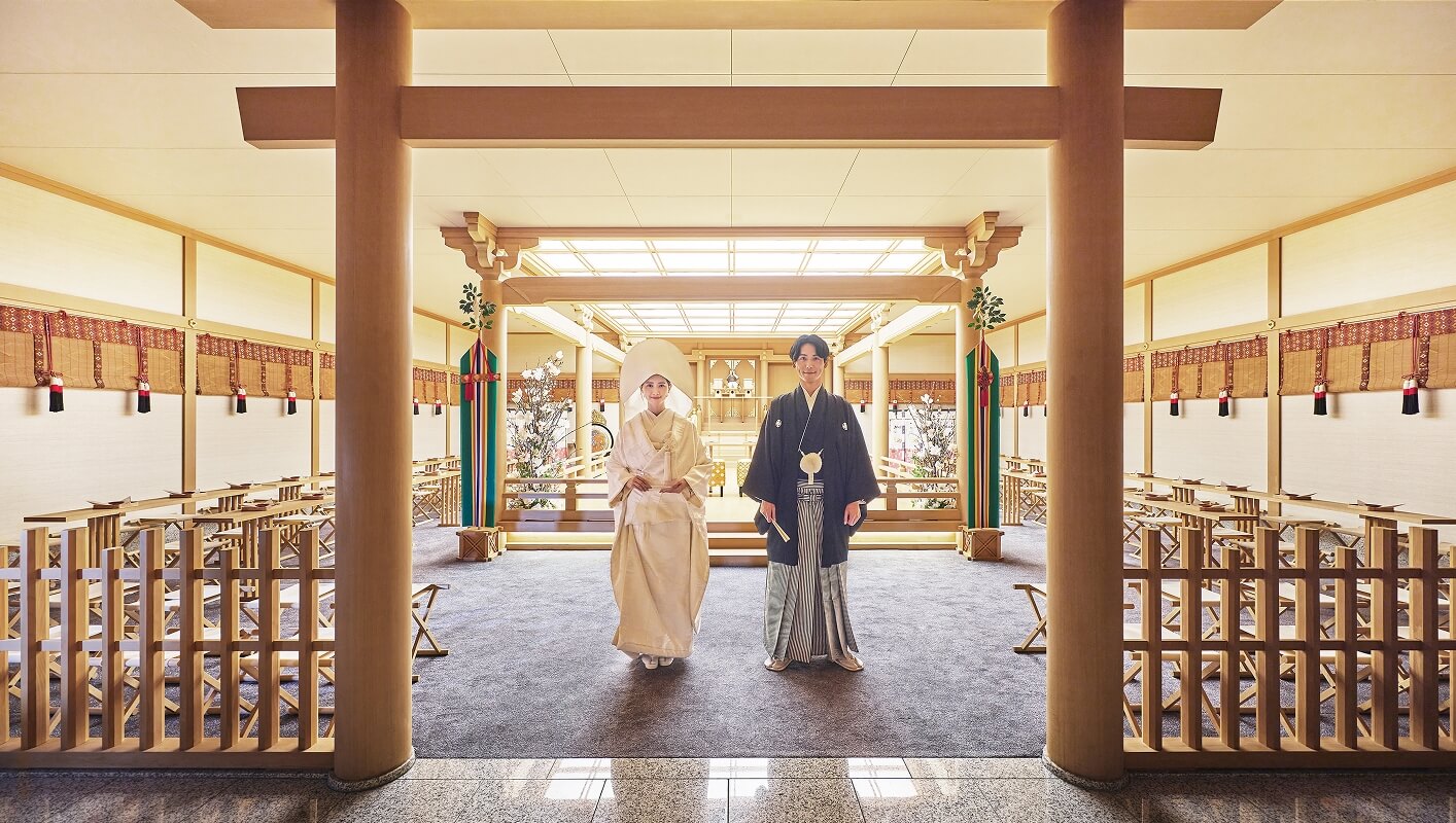 伊勢神宮の御霊を祀る由緒正しい神殿「鳳翔殿」。木の香りが漂う総白木造りの空間で、古式ゆかしい儀式にのっとり、ふたりの永遠の契りを厳かに結びます。