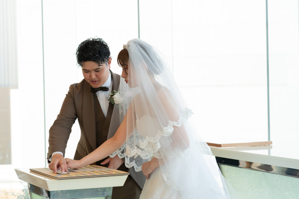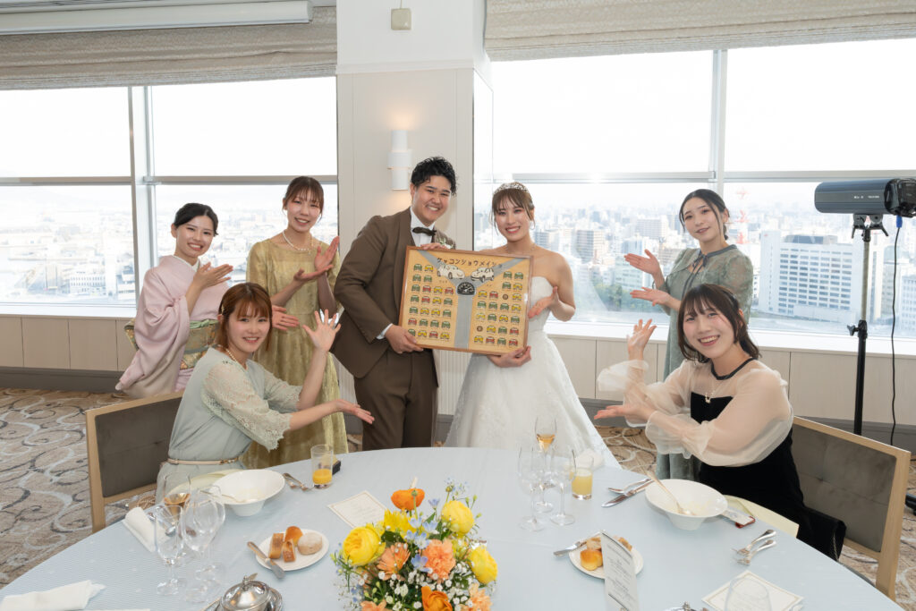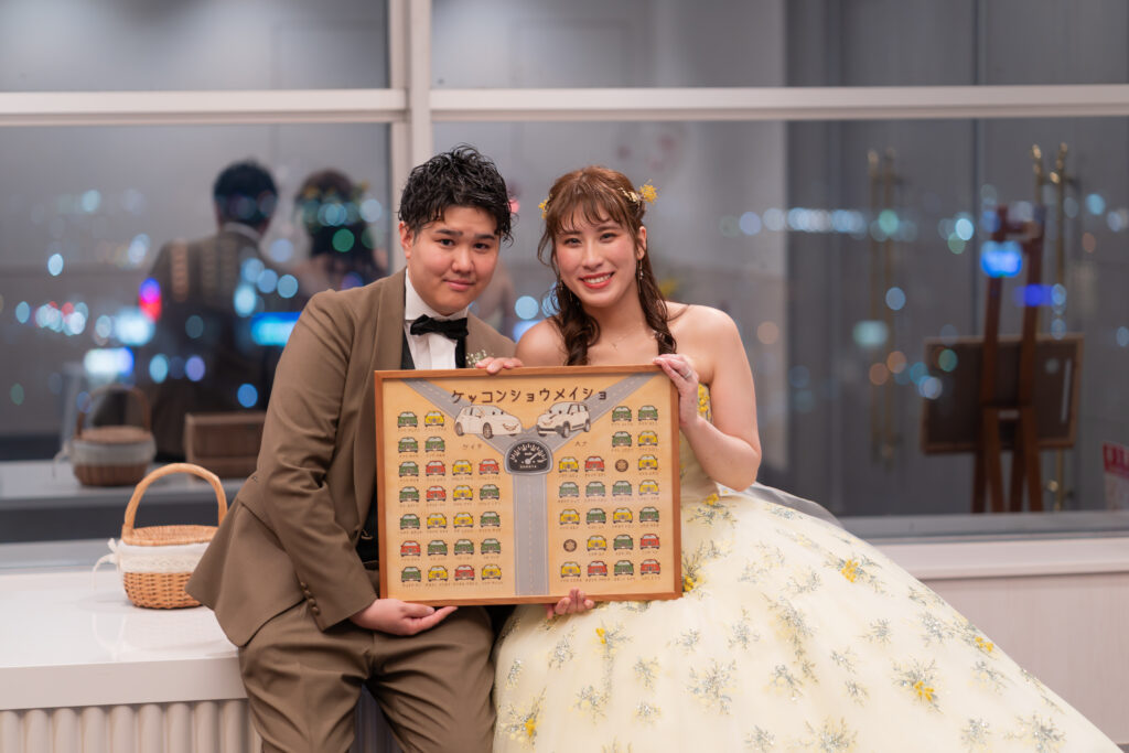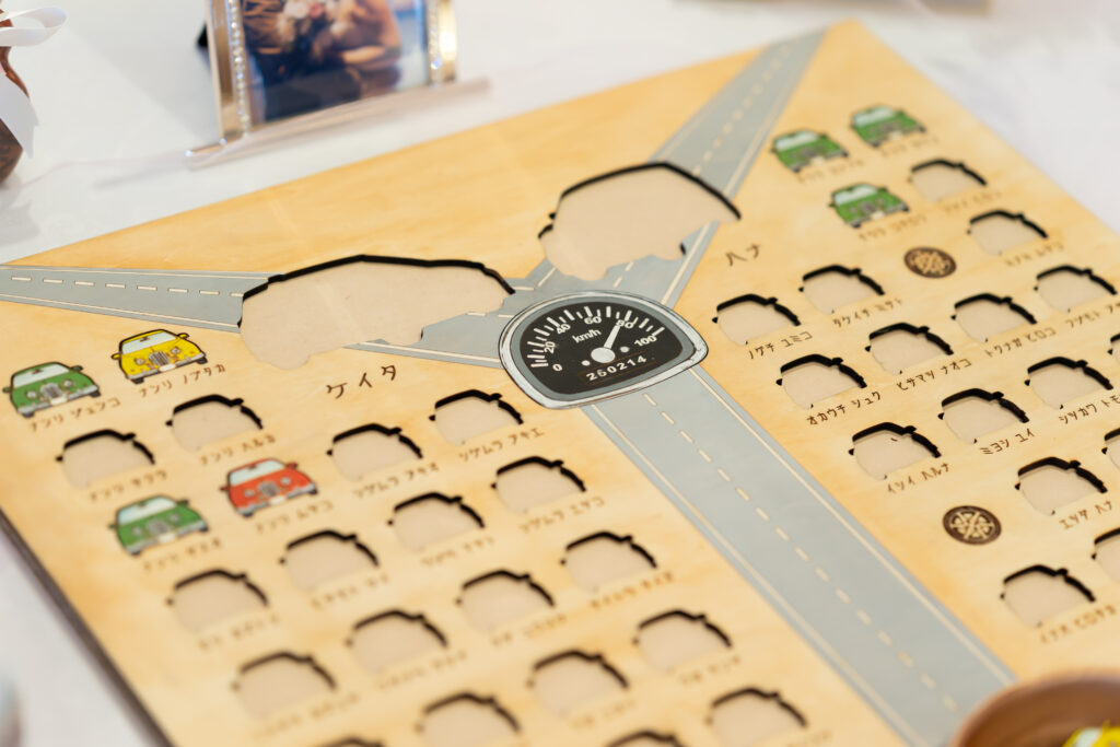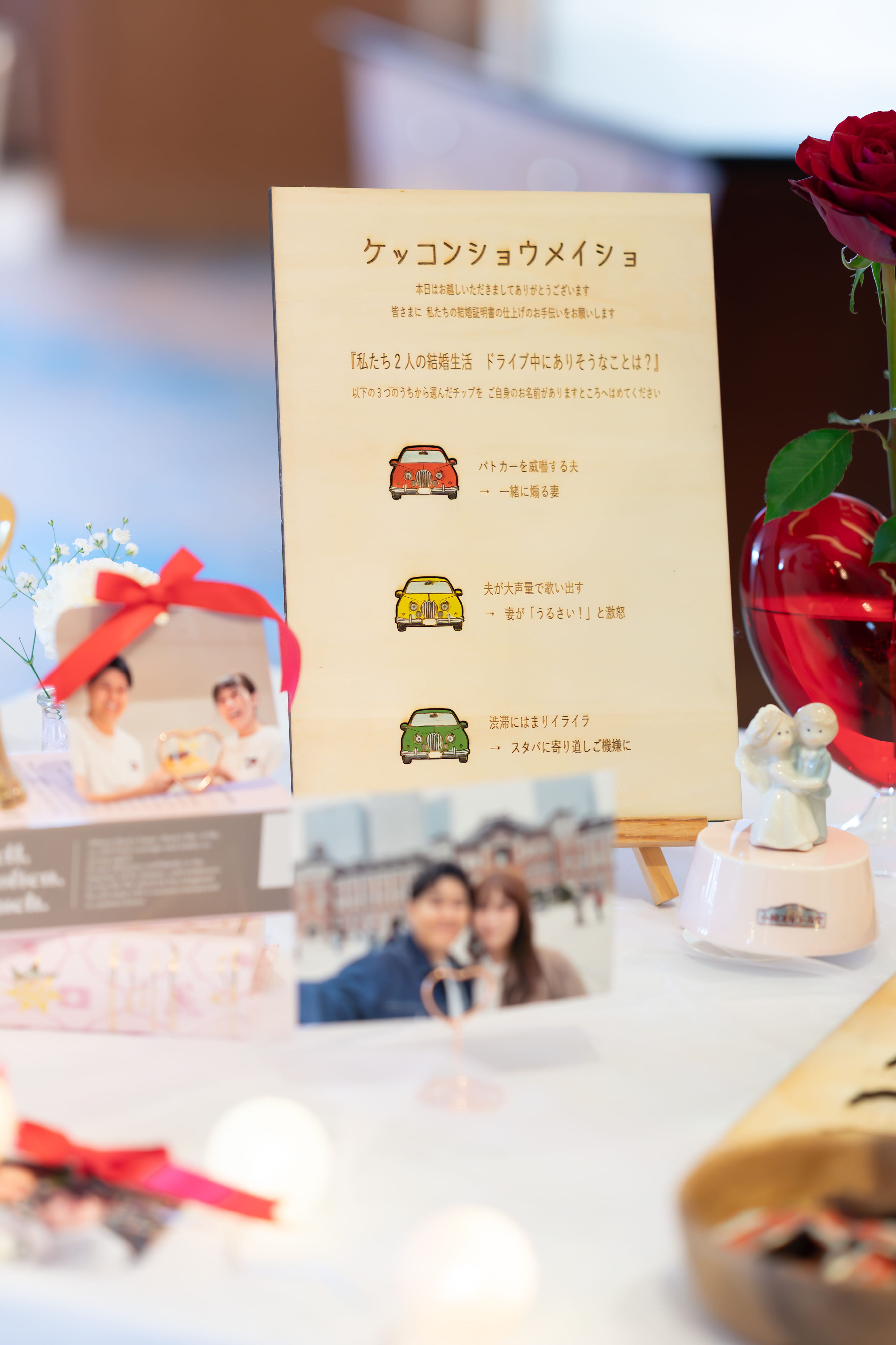 新郎さまのお仕事にちなんで選ばれた結婚証明書は車のデザインに。ゲスト参加型の素敵な演出となりました。