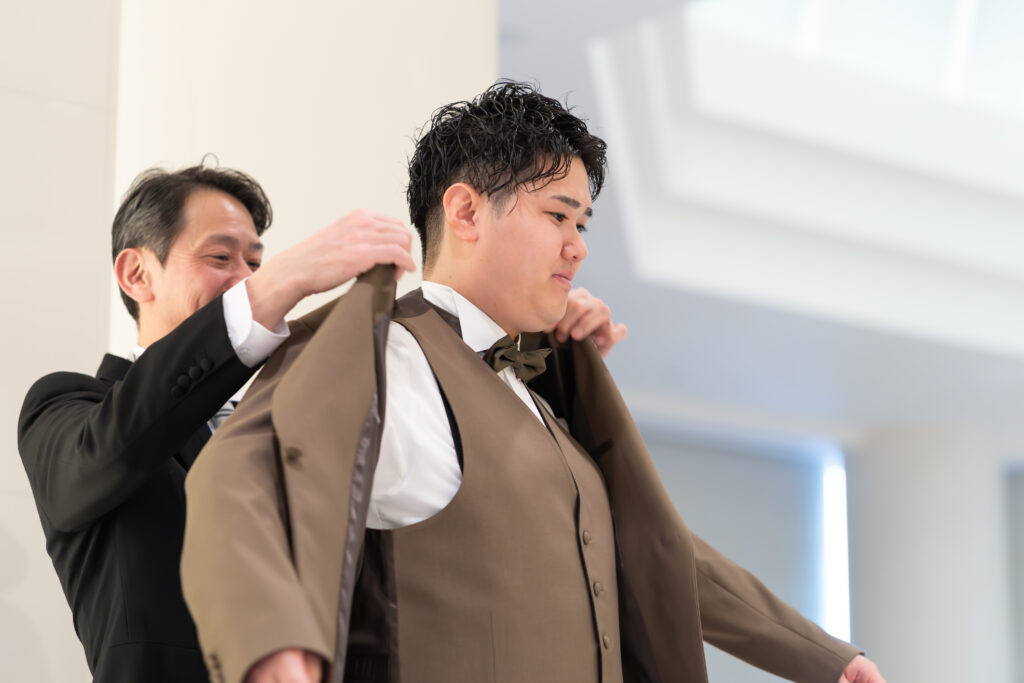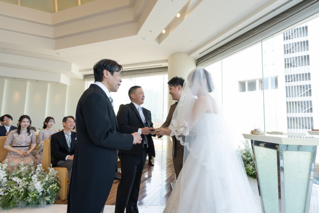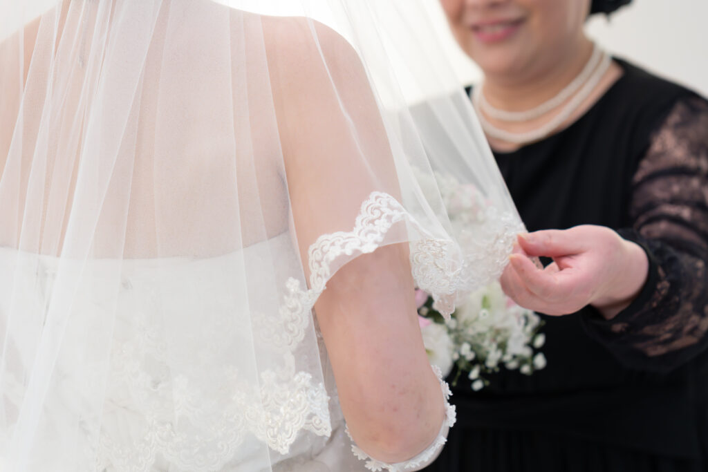 新郎へお父様からジャケットを羽織らせ、お母様からのブートニアセレモニー、そして新婦へ贈られるベールダウン。