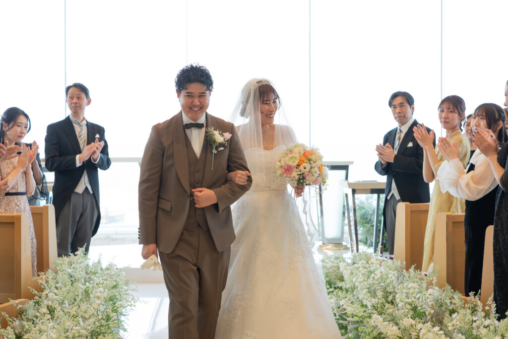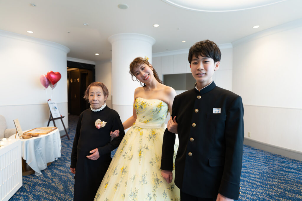 お色直し後の再入場では、新郎さまはおばあさまと、新婦さまはおばあさまと弟さんと手を取りながらのサプライズ入場。