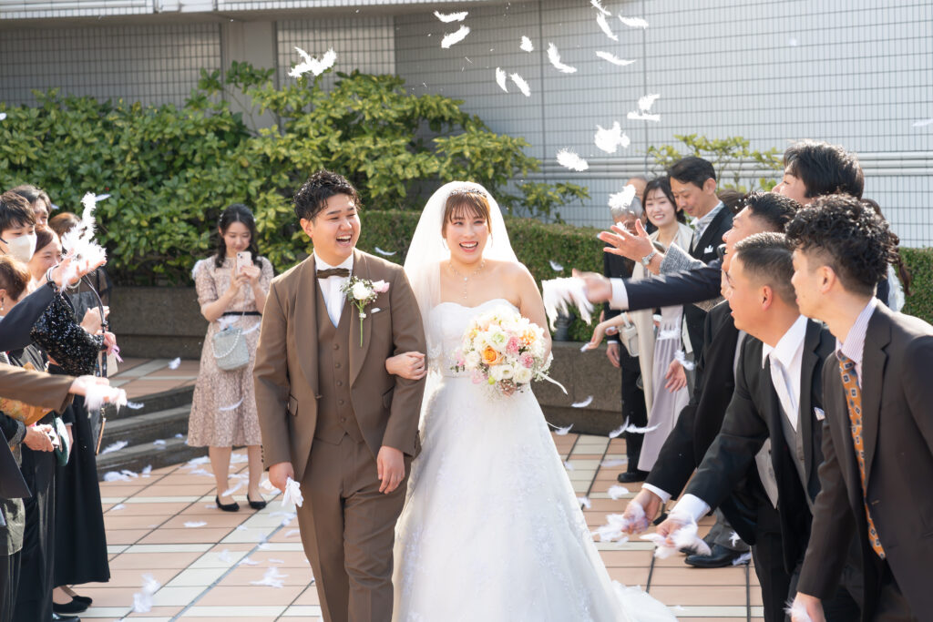 やさしく舞うフェザーシャワーに包まれながら歩まれるおふたり。