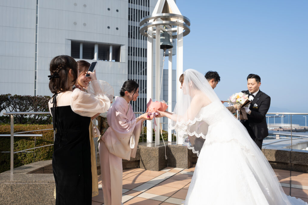 挙式のあとは、青く広がる瀬戸内海を背景にアフターセレモニーへ。澄んだ空の下、誓いの鐘が響きます。
