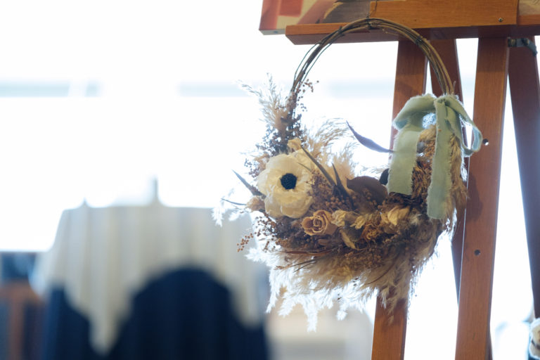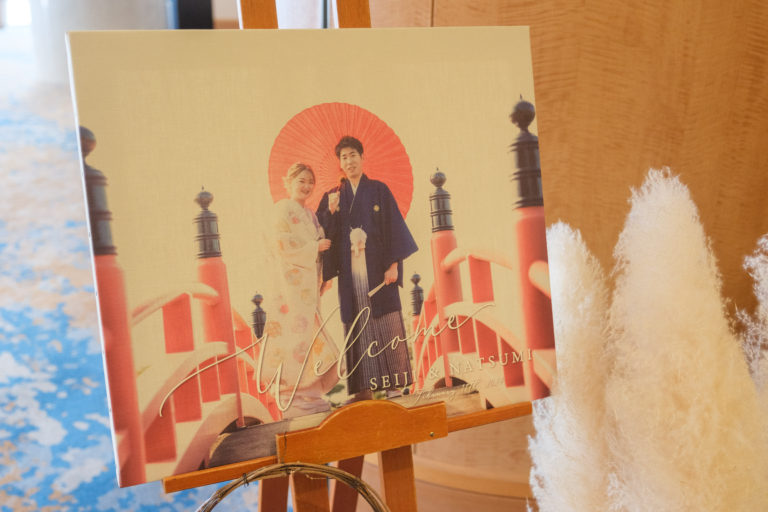 受付には、おふたりの手作り、お持ち込みのものをたくさん飾りました。お待ちいただく間もゲストに楽しんでもらえるように、そんな想いを込めてご準備くださいました。