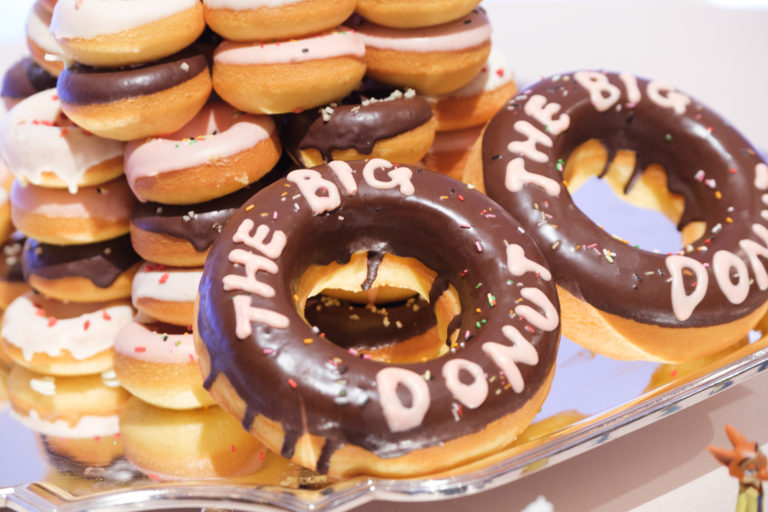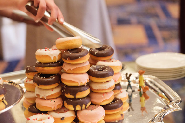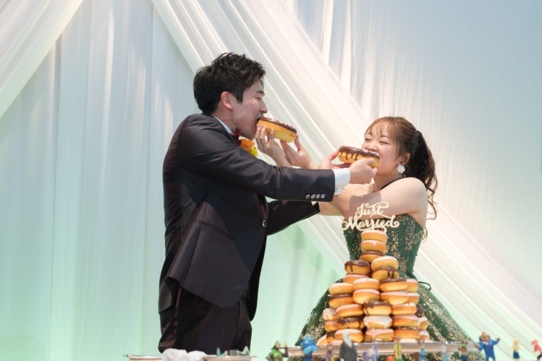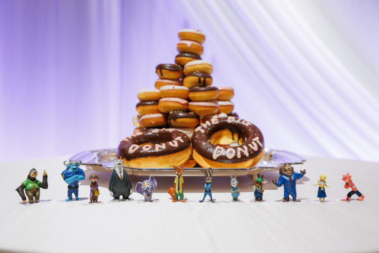 新婦様がディズニー映画「ズートピア」がお好きとのことで、映画に出てくるドーナツをそのまま再現したドーナツケーキでファーストバイトを行いました。ケーキのそばにはおふたりがご持参したフィギュアも一緒に♪そのあとはみんなにも食べてもらいたい!ということでブッフェにしてお召し上がりいただきました。