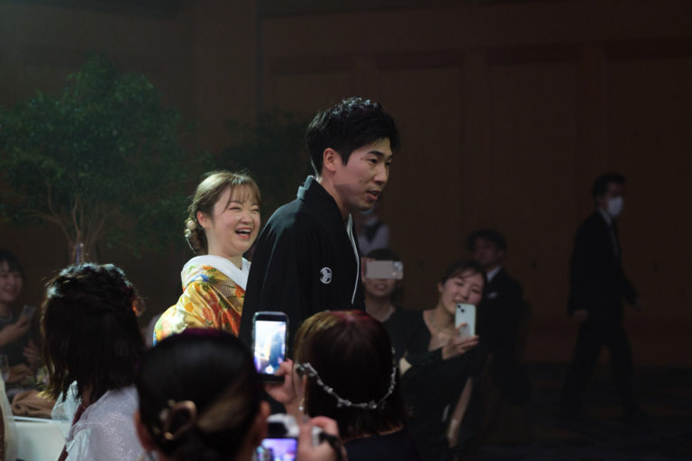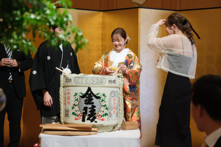 和装でのイベントとして、乾杯を「鏡開き」で行うことに。さらに、ゲストのお呼び出しをし、おふたりから直接お注ぎするイベントは会場全体が盛り上がりました!