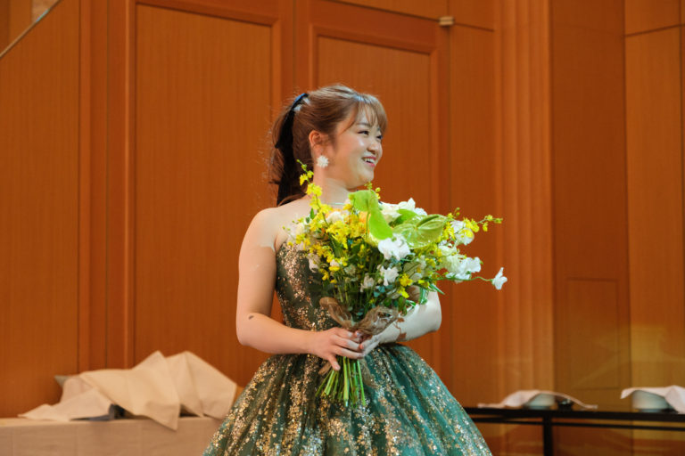 おふたりの会場はグリーンがメインで、高い天井を生かした装飾が圧巻でした。その会場に合わせて、次のお衣裳はキラキラのグリーンドレス♪