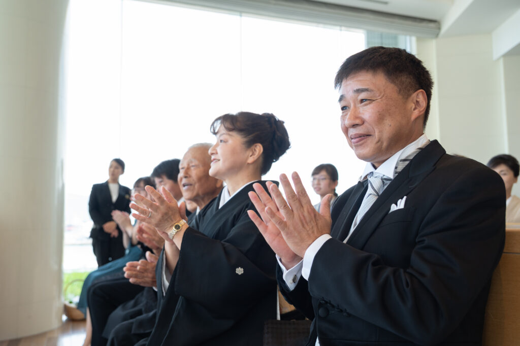 大切な人たちに見守られながら始まった人前式は、あたたかな拍手とやさしいまなざしに包まれていました。