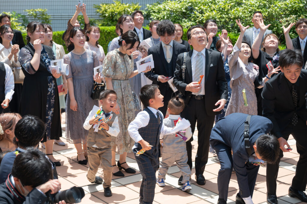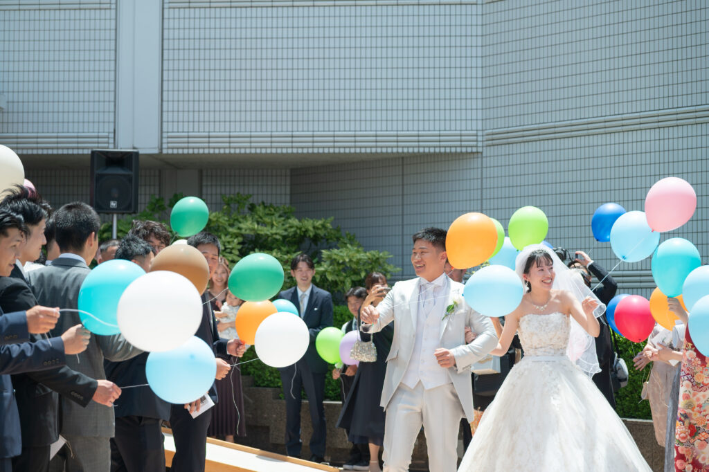 挙式後のアフターセレモニーでは、青空の下でのバルーンリリース。