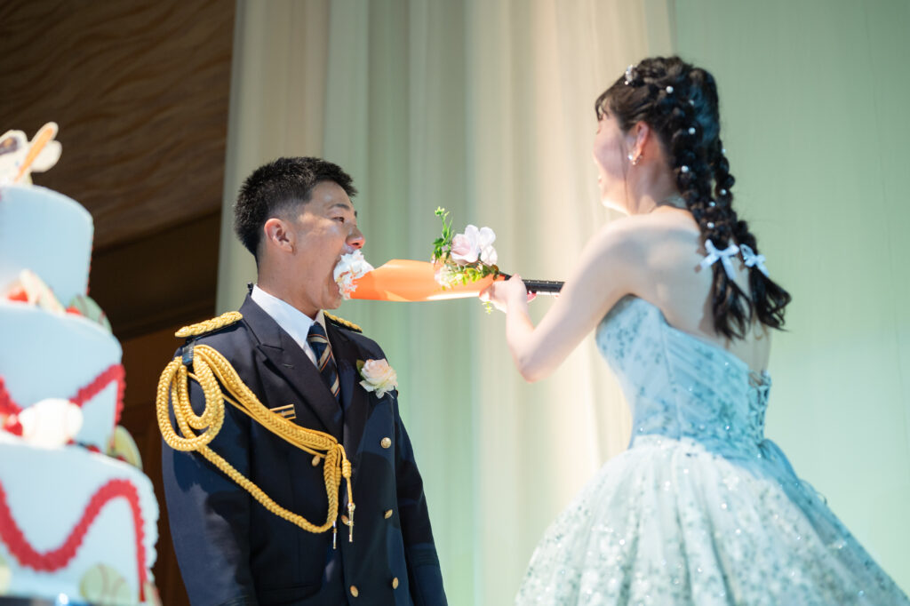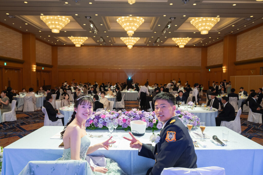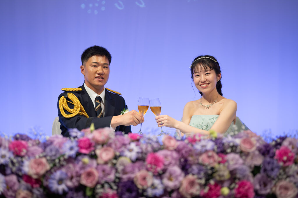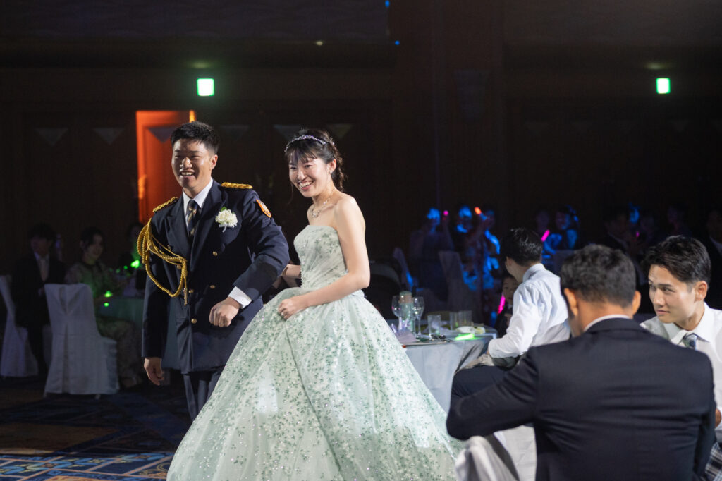 制服姿の新郎様と、ドレス姿の新婦様が並ぶ姿に、会場からはあたたかな拍手と笑顔が広がります。